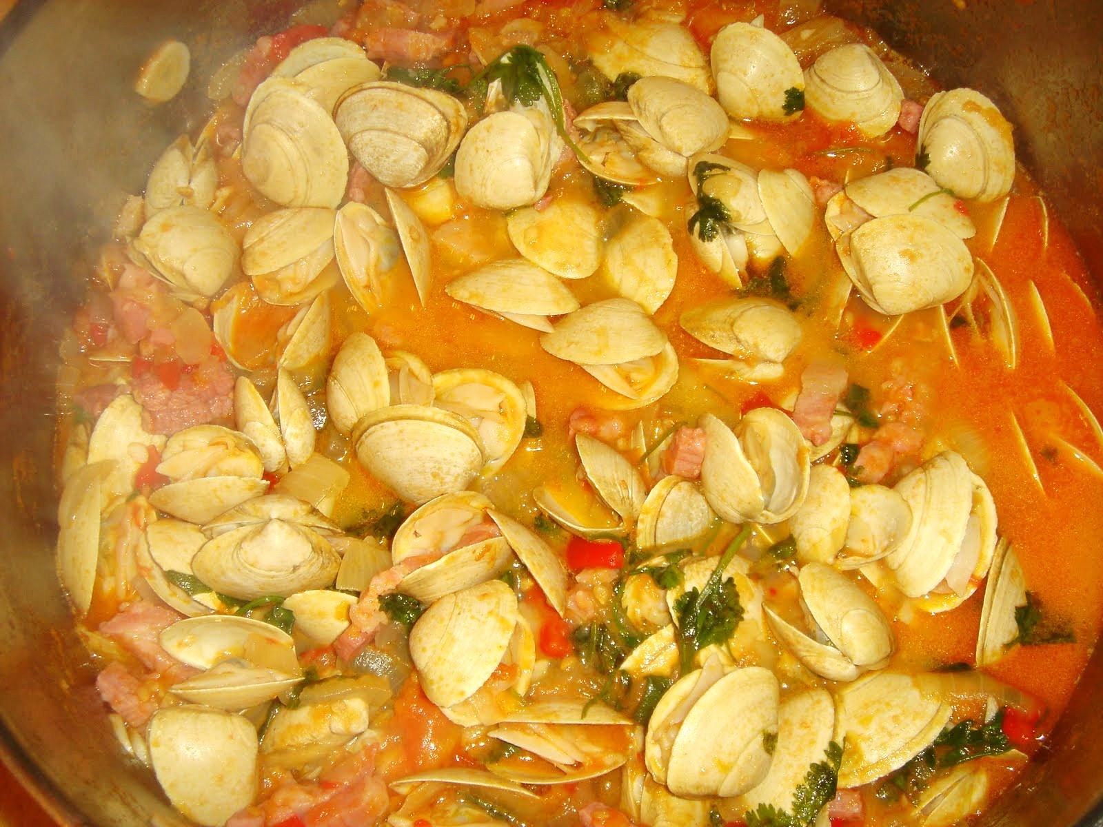 - Acrescentam-se-lhe as amêijoas que devem ferver em calda até abrirem sacudindo-se o tacho de vez em quando.